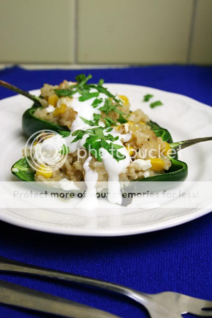 - Preheat the oven to 400°. Remove the peppers from the bowl and gently rub off the skins. Cut a slit lengthwise in each pepper and remove the seeds and membranes. Fill each pepper with the rice mixture and arrange tightly in a baking dish. Sprinkle with queso fresco and bake for 10-15 minutes, until bronzed on top.